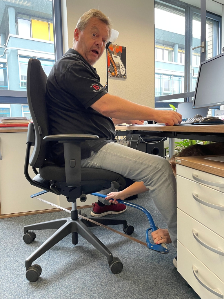 Aber keine Sorge: Nur auf den Fotos wird am Stuhl gesägt – und das sorgt für jede Menge Spaß und gute Laune. Niemandem ist etwas passiert.